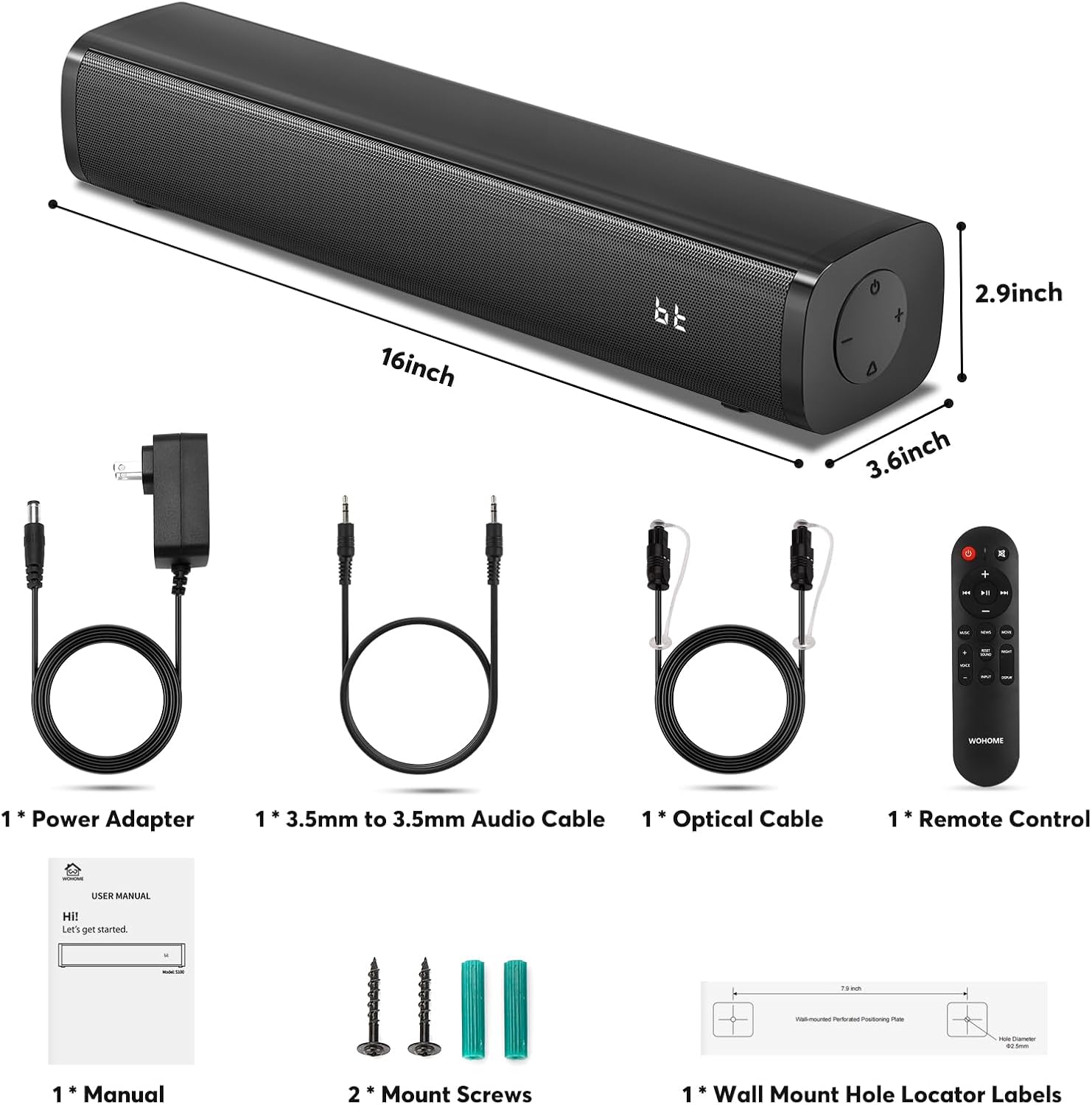 The Wohome S100 Soundbar also offers versatile connectivity options, including optical, AUX, and USB connections, allowing you to connect to a variety of devices for seamless integration into your entertainment setup.